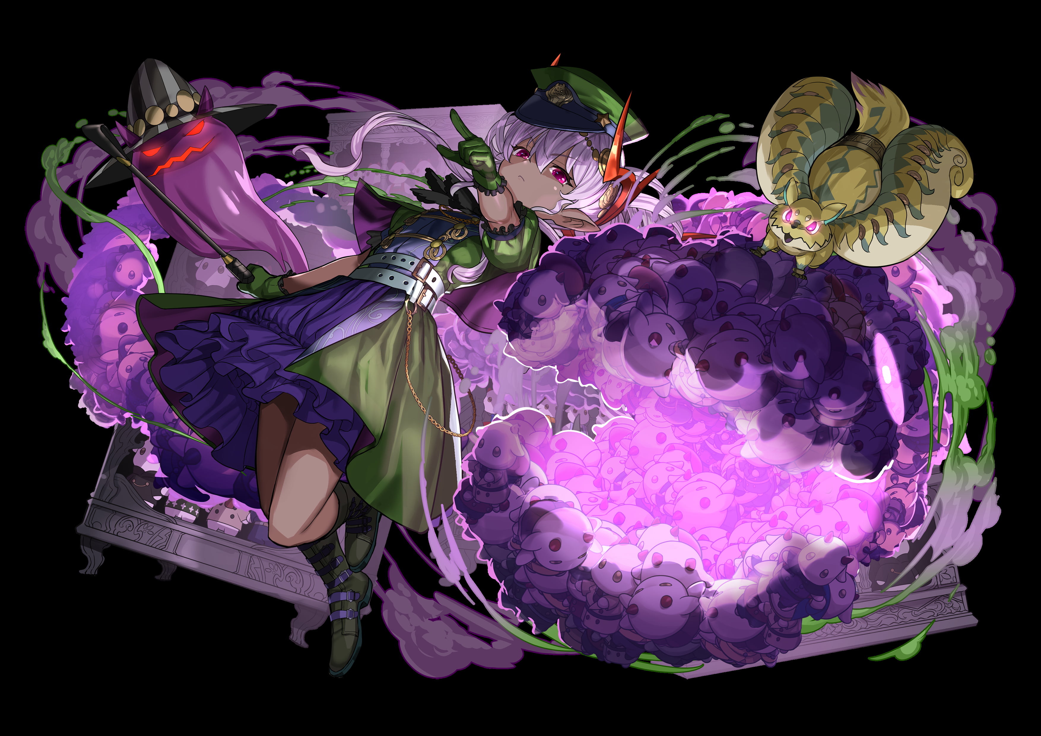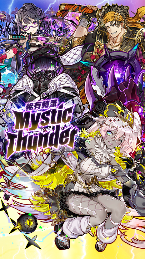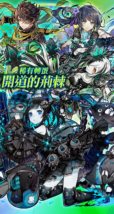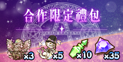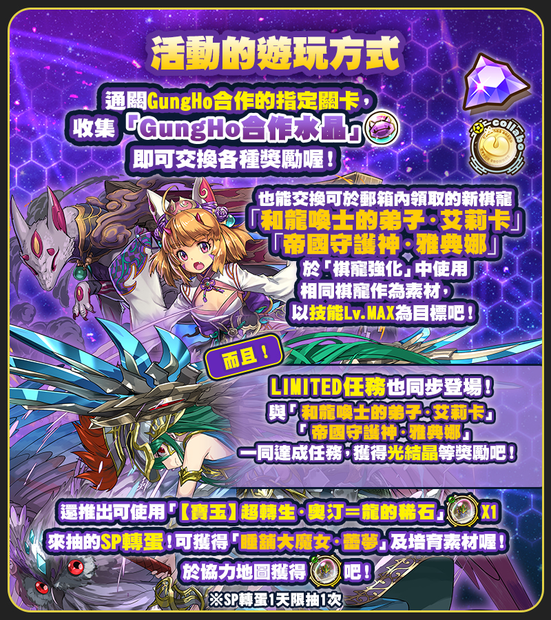 ★ GungHo合作白金轉蛋券_陣容包含:「睡舖大魔女・蕾夢」、「人魚&魅魔」、「踢踢公主&飛機駕駛員」、「妖精王・亞拔特」、「岩拳大魔女・瑟菈」、「巫龍喚士・莉蓓」、「光芒的魔法使・巫師」、「繼承意志的神童・邦」、「隱密烏・烏羽黑鳥」、「陰陽省的宗主・御影」、「龍刀・宙天丸」