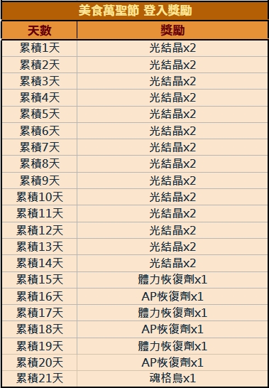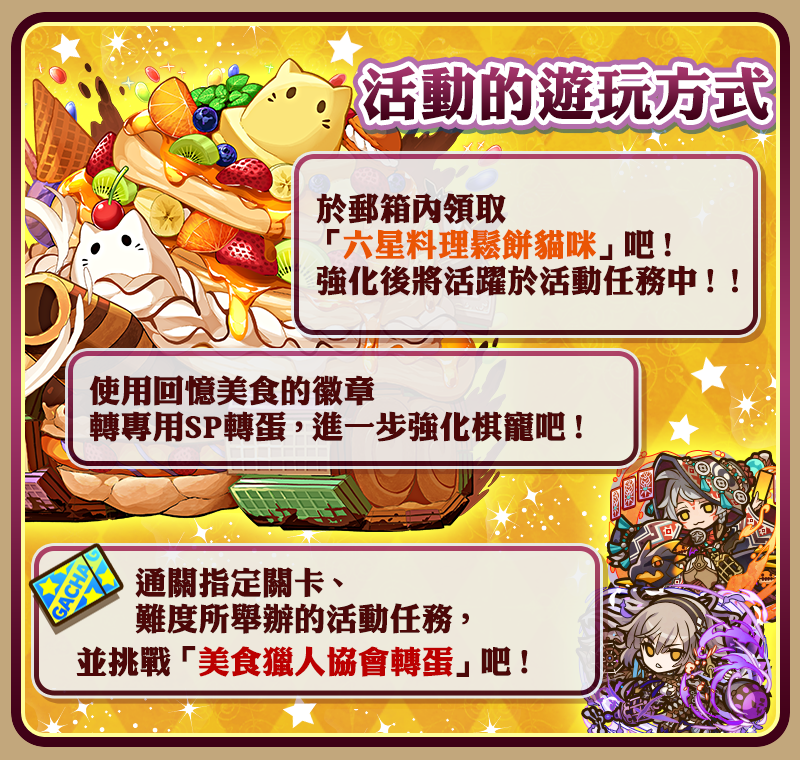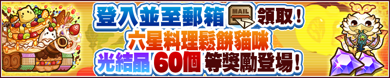 期間登入& Lv4 以上 可領取 光結晶60顆、「六星料理鬆餅貓咪x1」、「超魂格鳥x1」、「大魂格鳥x1」、「魂格鳥x1」!