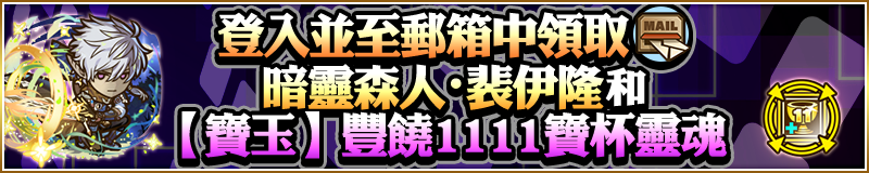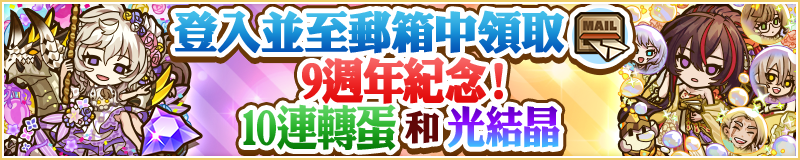 期間登入& Lv4 以上 可領取「9週年紀念10連轉蛋x1」、「暗靈森人・裴伊隆x1」、「【寶玉】豐饒1111寶杯靈魂x1」